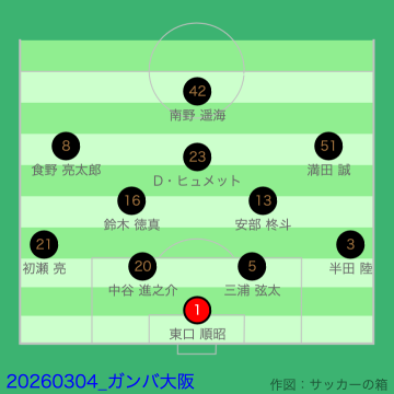 1点を追うガンバは、ハーフタイムで初瀬と満田を下げ、